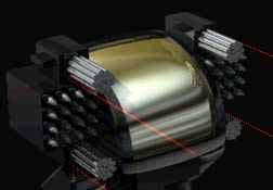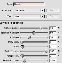 9. After this I made the cockpit. This is just an extruded and slightly distorted quarter-circle. To make the glass windscreen I made a negative cube attached to the cockpit and made a smaller version of the cockpit with a glass texture. The chain guns are made with a beveled cube and a smaller one for the laser sight. The actual laser is a highly focused red spotlight with visible rays. The barrels of the guns are made by copying cylinders with one end-cap in a circle. The rockets are just boxes with rows of lathed pointed cylinders. I added a cube on the back just to make it look less flat from the back. |