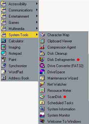 Scan Your Hard Drive for ErrorsHaving errors on your hard drive can cause programs to run incorrectly and even crash the computer. This problem is easily combated with a program that comes with Windows. Using the Scan Disk feature in the System Tools folder in the Accessories folder (view the picture below). If you have the problem of scanning reseting, try closing down all running programs, you can do this by pressing control+alt+delete and closing down all programs besides Explorer. This should solve the problem. (Pushing this with Windows 3.11 or lower will cause system to restart)